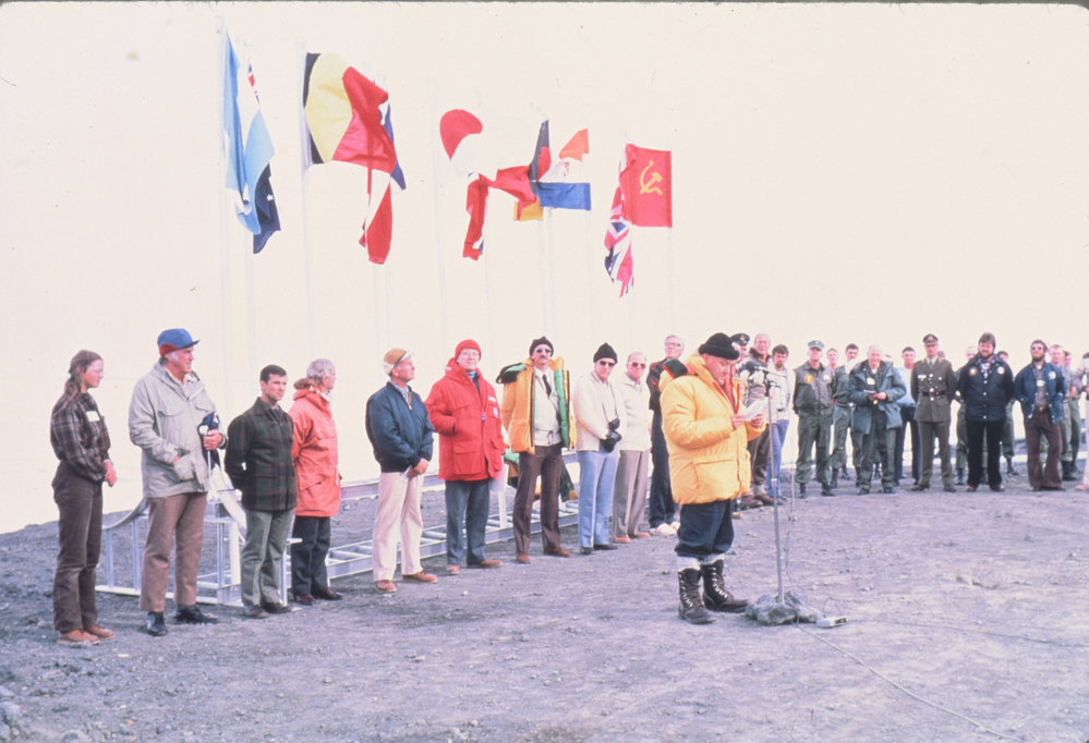 AddBy: Kathleen Palmer (Smith)26th Jun 2016 10:00PMOn the far left is Kathleen Smith, who as youngest member of the Scott Base team, raised the flag for the 25th Anniversary. Next to her is Sir Edmund Hillary who has the old flag tucked under his arm. Tony Newton, Deputy Officer in Charge...