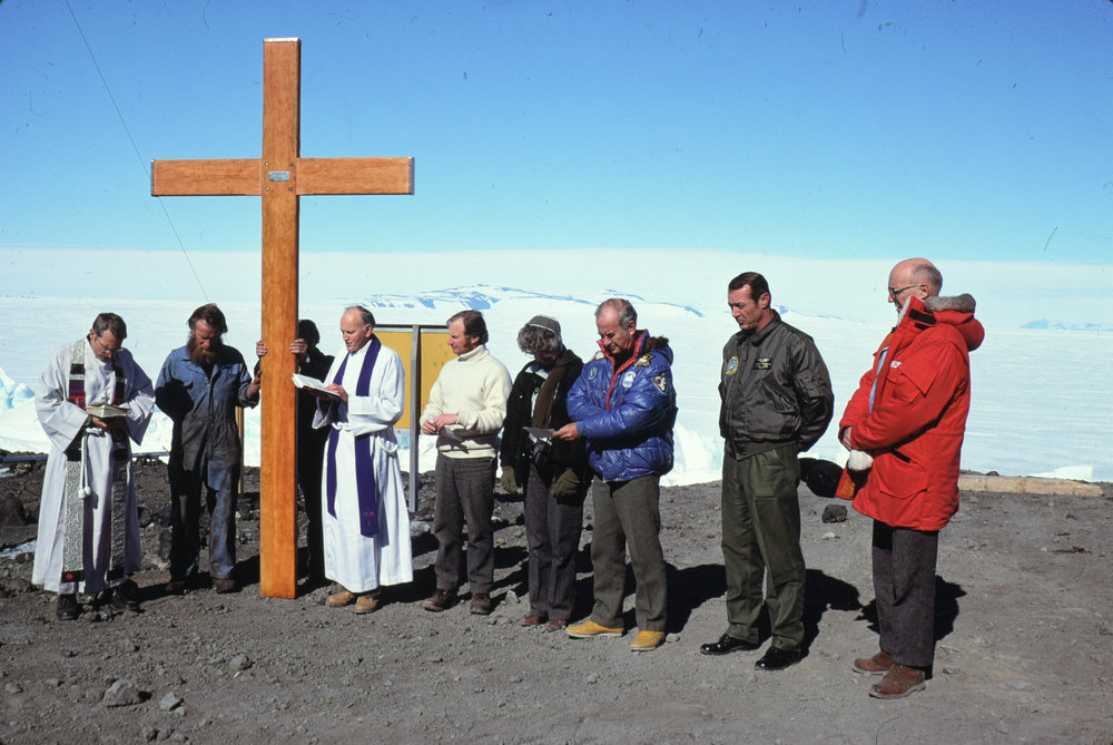 DescriptionDedication of Memorial cross for the victims of Flight TE901PhotographerNigel S RobertsSeason1979-1980Date Taken1979-1980 SeasonOriginalSlideNo. People5-10LocationMount Erebus Disaster Crash SiteGeolocation[1] Position