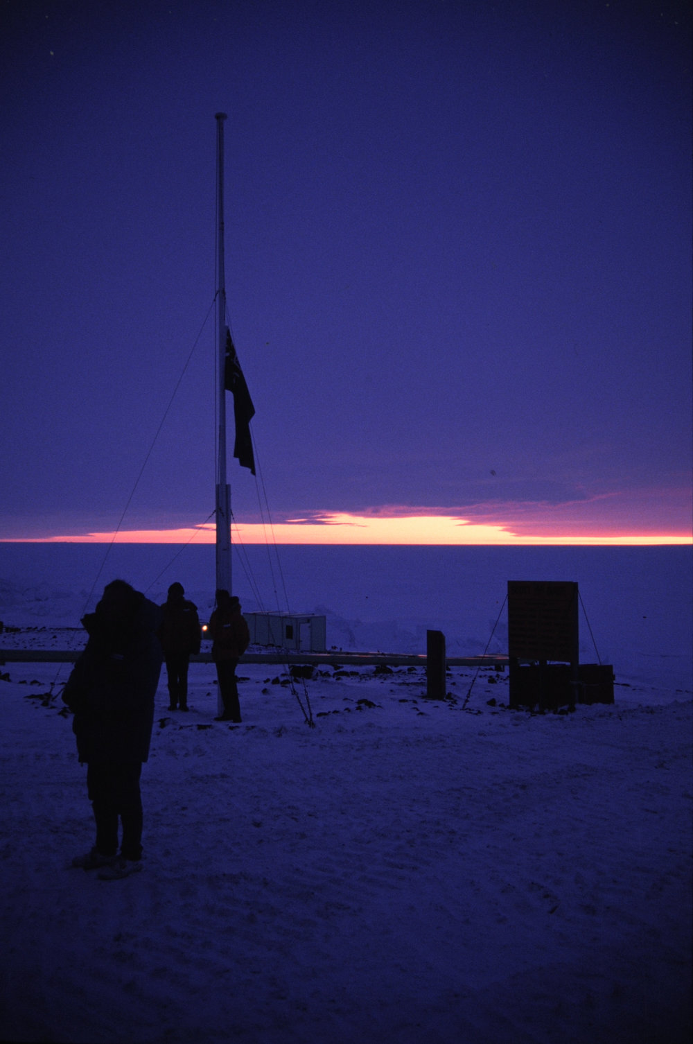 DescriptionHistoric, Dawn lowering ceremony, Varcoe and NewportPhotographerNicola HolmesDate Taken1992-10-14OriginalSlideNo. People2-5LocationScott BaseGeolocation[1] Position