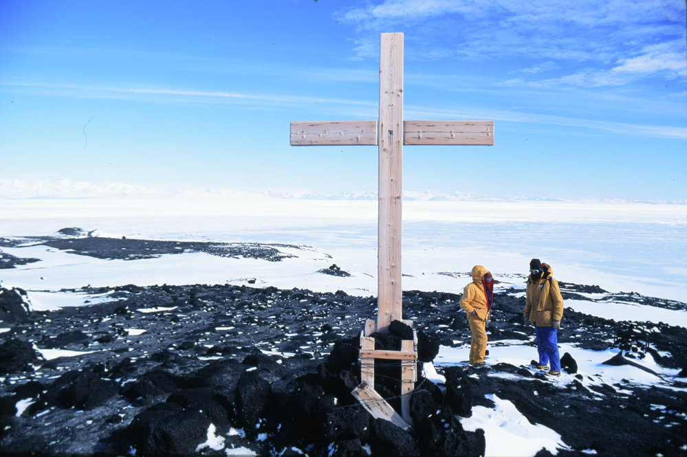 DescriptionMemorial Cross on Windvane hill at Cape EvansPhotographerKeith LyonsSeason1994-1995Date Taken1994-1995 SeasonOriginalSlideNo. People2-5LocationWindvane HillGeolocation[1] Position
