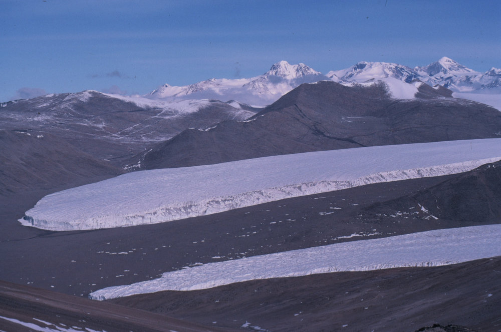 DescriptionAcross Miers and Adams Glacier towards Mt DromedaryPhotographerJack McConchieSeason1989-1990Date Taken1989-1990 SeasonOriginalSlideLocationAdams GlacierGeolocation[1] Position