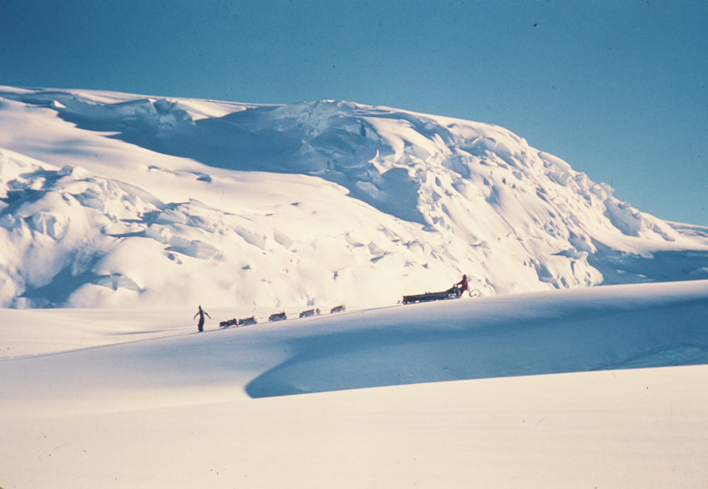 DescriptionSkirting a crevasse on the Axel Heiberg GlacierSeason1961-1962Date Taken1961-1962 SeasonOriginalSlideNo. People2-5LocationAxel Heiberg GlacierGeolocation[1] Position