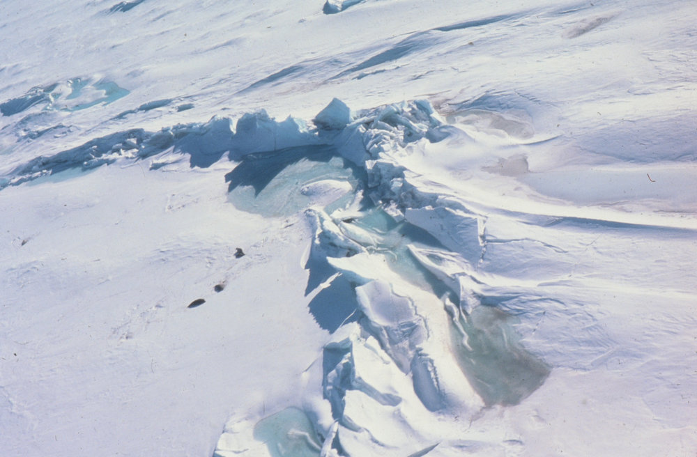 Aerial shot of pressure ridges and melt pools, with seals on the ice