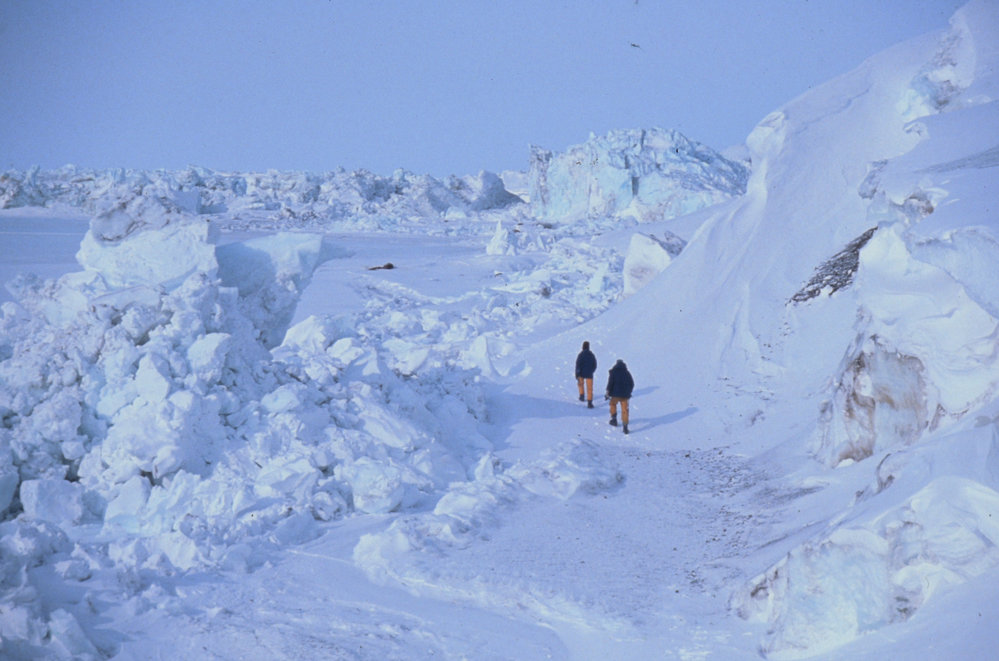 DescriptionTwo men walk over sea ice at Cape CrozierPhotographerDon AndersonSeason1991-1992Date Taken1991-1992 SeasonOriginalSlideNo. People2-5LocationCape CrozierGeolocation[1] Position