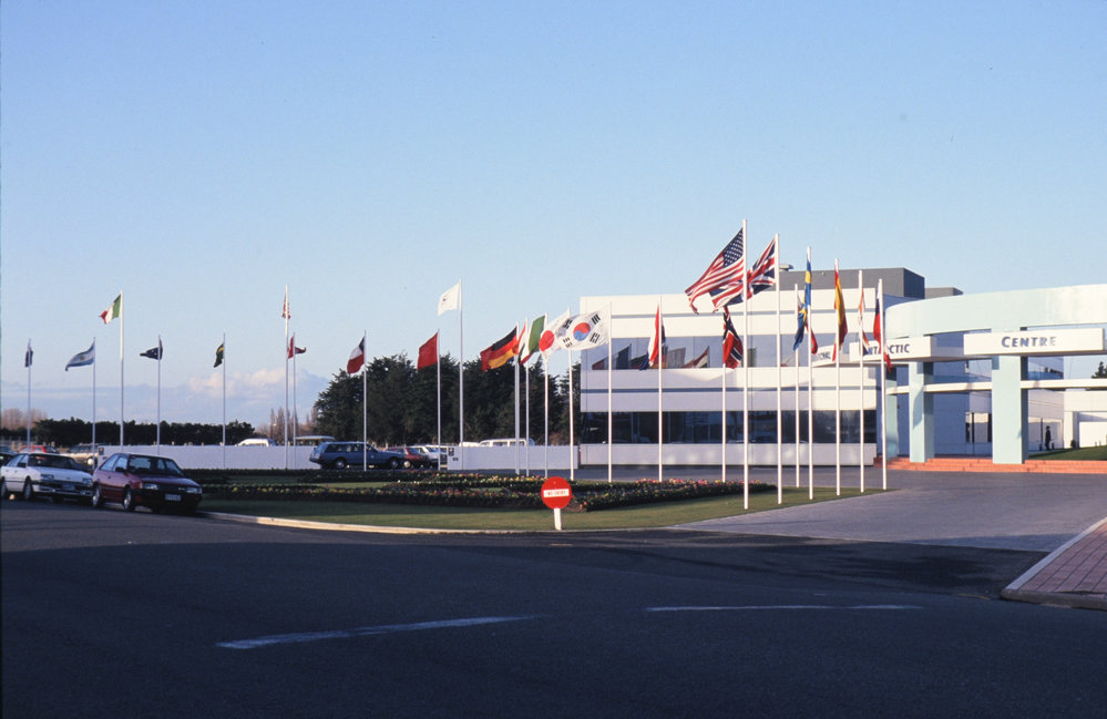 1993 COMNAP Delegates- flagpoles at the International Antarctic Centre. Antarctica NZ, accessed 16/04/2026, https://adam.antarcticanz.govt.nz/nodes/view/12370