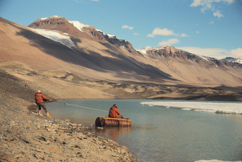 DescriptionLake Vanda, moat and boat, Asgard Range behindPhotographerDavid RandallSeason1970-1971Date Taken1970-1971 SeasonOriginalSlideNo. People2-5LocationLake VandaGeolocation[1] Position