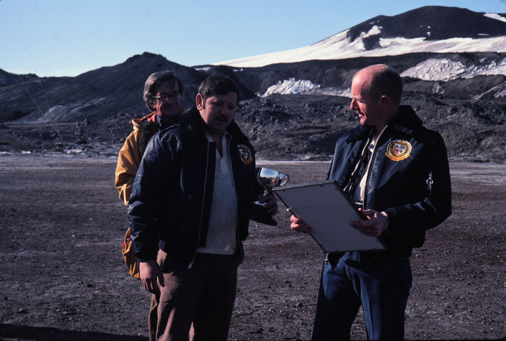 Norman Hardie, Jim Cavey, Brian Shoemaker after Scott Base beat McMurdo in tug-o-war for Governor O'Neal's trophy. Antarctica NZ, accessed 20/03/2026, https://adam.antarcticanz.govt.nz/nodes/view/13180