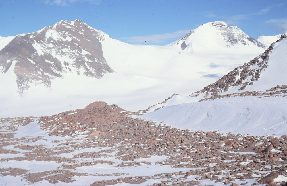 View Across Salient Glacier from Frostbite Spine - Paddington Peak on the left, Frio Peak on the right.