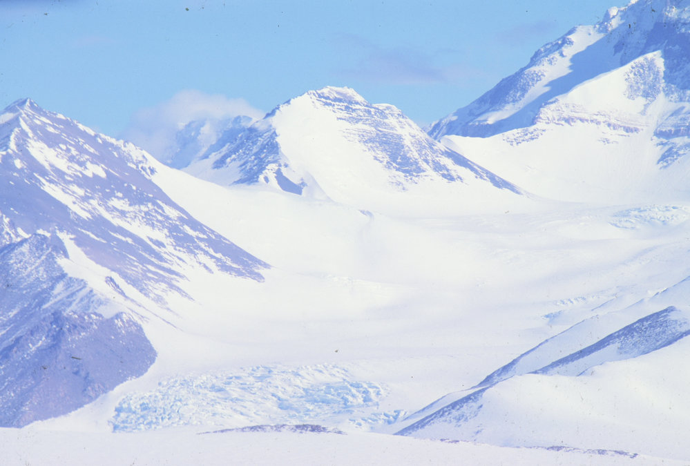 Left to right - Paddington Peak, Frio Peak and Salient PeakSeason1979-1980Date Taken1979-1980 SeasonOriginalSlideLocationSalient GlacierGeolocation[1] Position