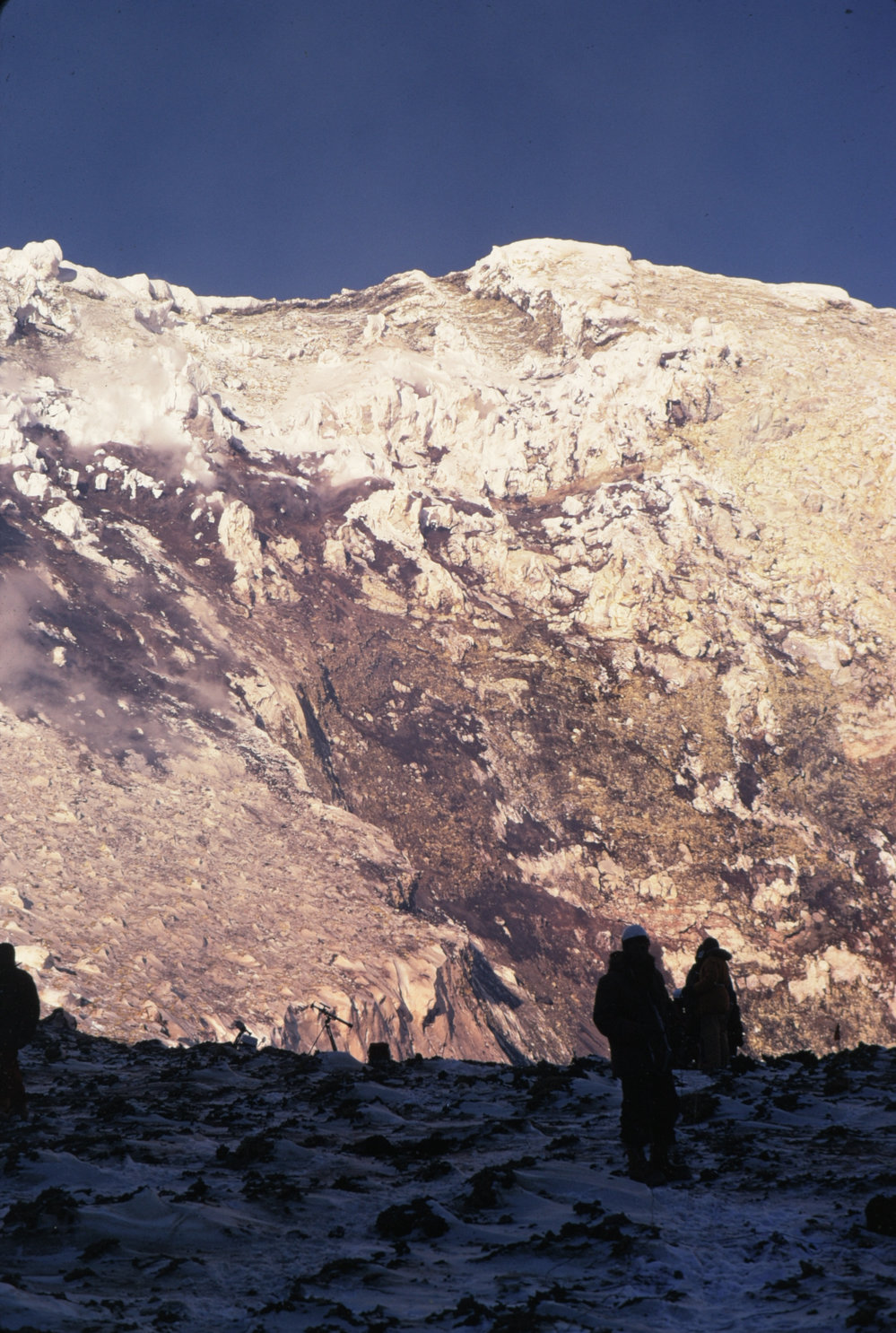 DescriptionEastern Crater wall in evening - main crater floor, near Inner CraterPhotographerJ R KeysSeason1974-1975Date Taken1974-1975 SeasonOriginalSlideNo. People2-5LocationMount ErebusGeolocation[1] Position