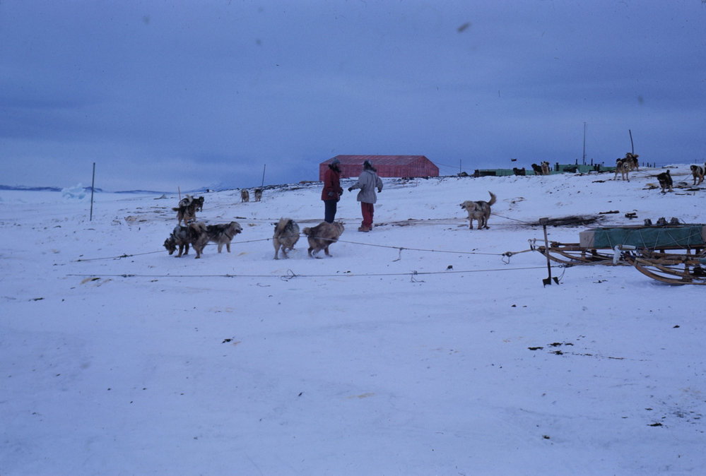 DescriptionScott Base Huskies on dog linesPhotographerJ W BeagleySeason1966-1967Date Taken1966-1967 SeasonOriginalSlideNo. People2-5LocationScott BaseGeolocation[1] Position