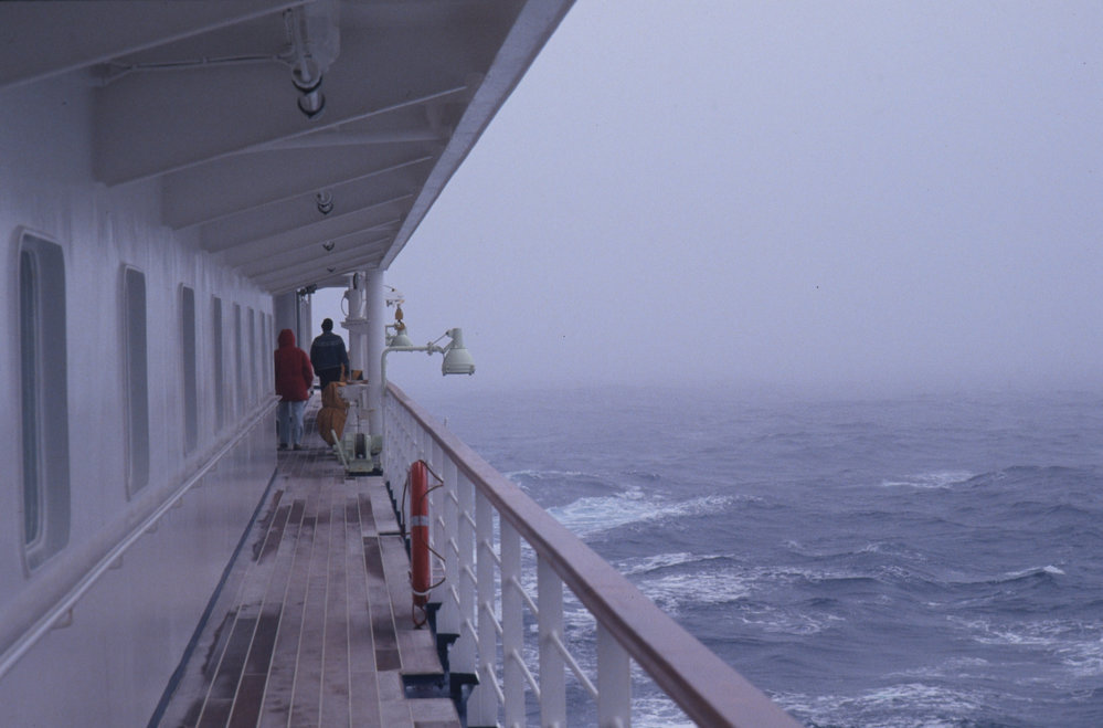 DescriptionFrontier Spirit on Deck and Sea Fog of Convergence.PhotographerGillian WrattSeason1992-1993Date TakenBetween 1st February 1993 and 28th February 1993OriginalSlideNo. People2-5LocationSouthern OceanGeolocation[1] Position