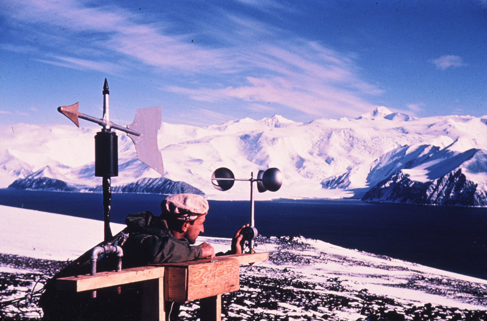DescriptionMeteorological equipment. Hallett Station on Mount Geoffrey Markham.Season1961-1962Date Taken1961-1962 SeasonOriginalSlideNo. People1LocationMount Geoffrey MarkhamGeolocation[1] Position