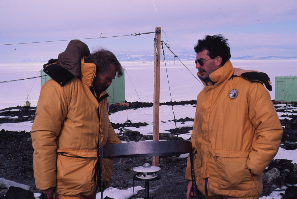 DescriptionRichard Heine, supt. of atmospheric physics Met Service (left). Roger Ridley Scott Base meteorologist inspect instrument measuring indirect solar radiation.DepictsRichard HeineRoger RidleyPhotographerSue O'DowdSeason1983-1984Date Taken1983-1984 SeasonOriginalSlideNo. People2-5LocationScott BaseGeolocation[1] Position