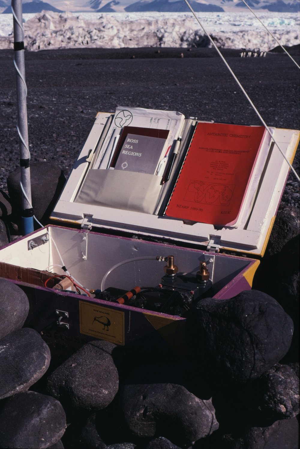DescriptionSampling equipment and data books at Cape Adare.PhotographerP SelwynSeason1989-1990Date TakenBetween 1st January 1990 and 31st January 1990OriginalSlideLocationCape AdareGeolocation[1] Position