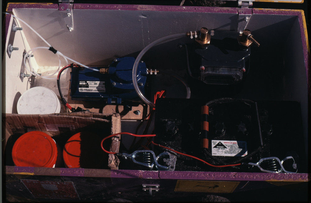 DescriptionPump, Battery, and Sample tube.PhotographerP SelwynSeason1990-1991Date TakenBetween 1st January 1990 and 31st January 1990OriginalSlideLocationCape AdareGeolocation[1] Position