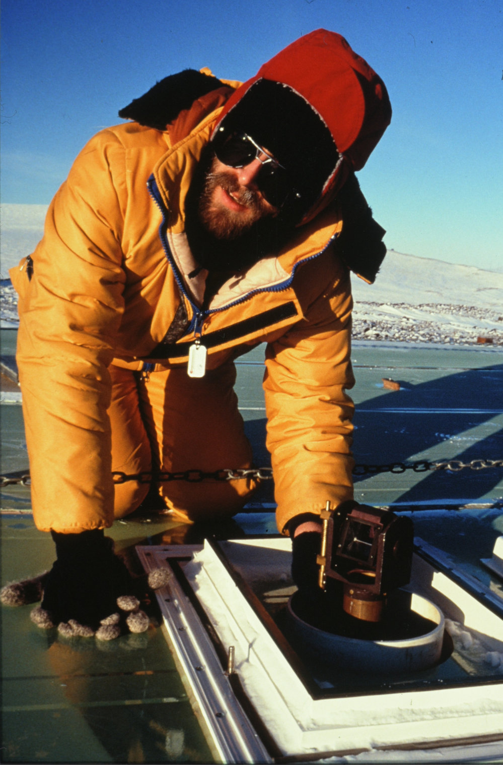 DescriptionOzone Research -Ross Martin (New Zealand Met. Service) adjusts prism of Dobson spectrophotometer at Arrival Heights.DepictsRoss MartinPhotographerKim WesterskovSeason1989-1990Date TakenBetween 1st September 1990 and 30th September 1990OriginalSlideNo. People1LocationArrival HeightsGeolocation[1] Position