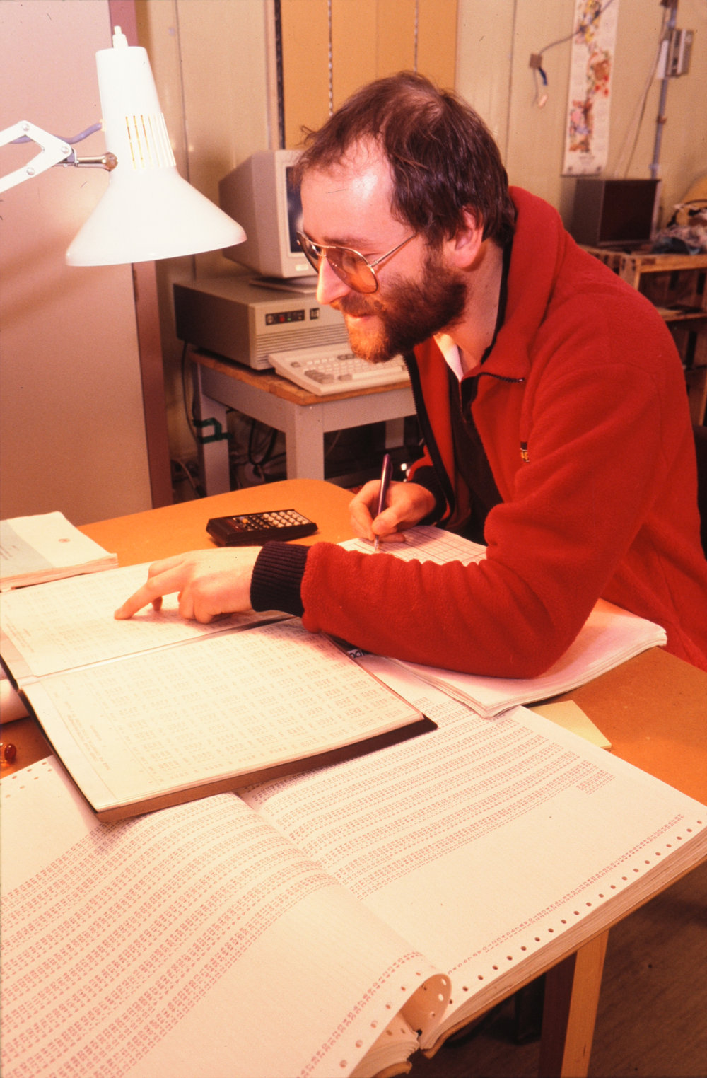 DescriptionRoss Marton calculates ozone levels after Dobson measurements at Arrival Heights.DepictsRoss MartinPhotographerKim WesterskovSeason1989-1990Date TakenBetween 1st September 1990 and 30th September 1990OriginalSlideNo. People1LocationArrival HeightsGeolocation[1] Position