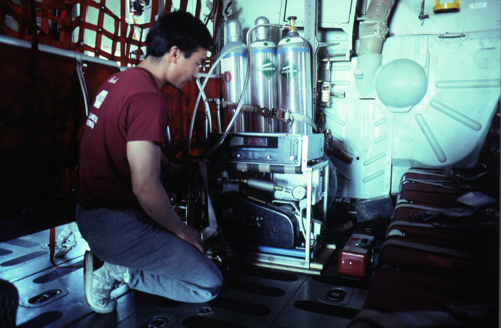DescriptionJohn Mak- compressor an three special high purity cylinders.DepictsJohn MakPhotographerC BrenninkmajerSeason1990-1991Date Taken1990-1991 SeasonOriginalSlideNo. People1
