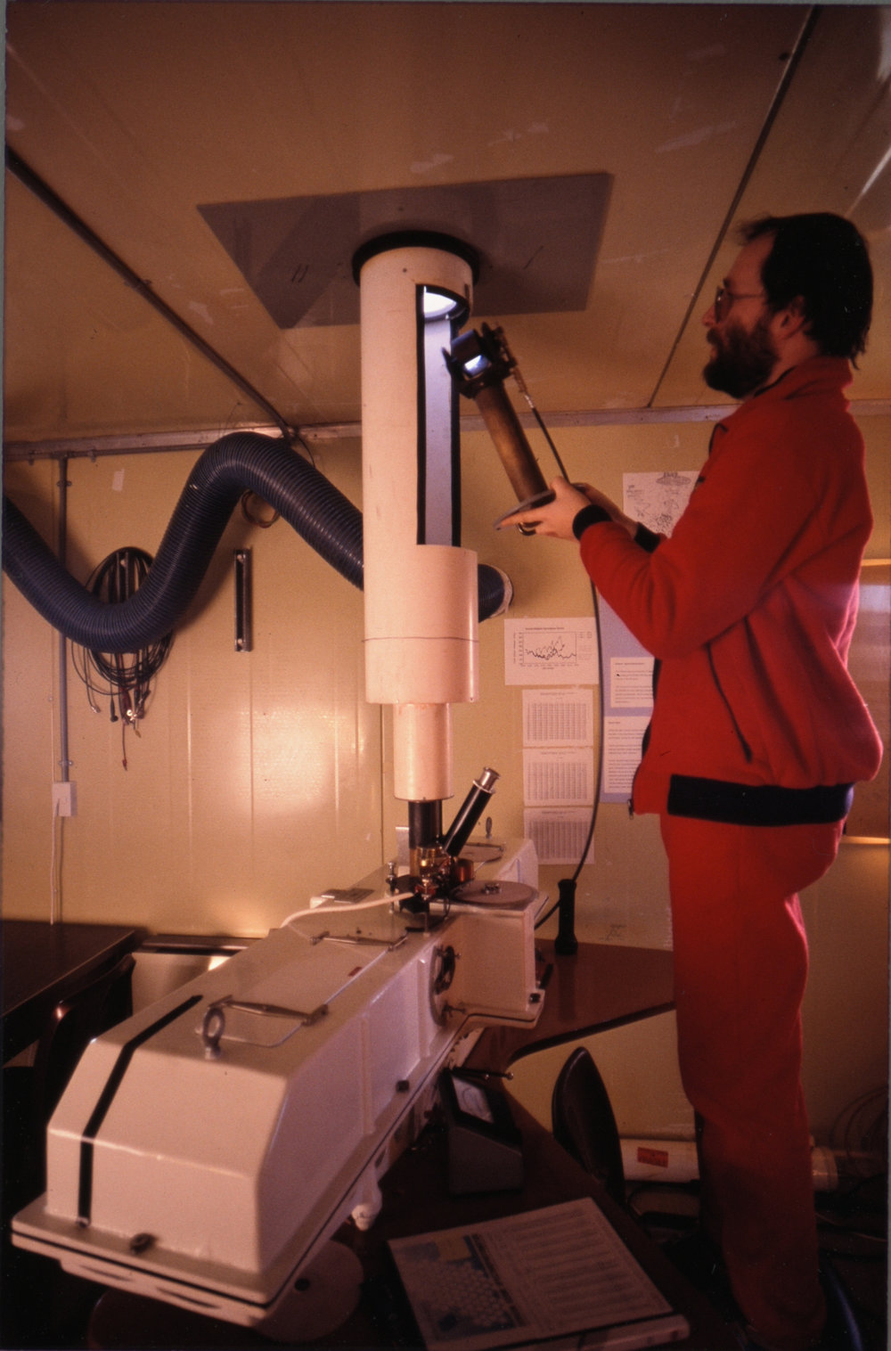 DescriptionRoss Martin inserts sunlight-catching prism of Dobson Spectrophotometer through roof at Arrival Heights.DepictsRoss MartinPhotographerKim WesterskovSeason1989-1990Date TakenBetween 1st September 1990 and 30th September 1990OriginalSlideNo. People1LocationArrival HeightsGeolocation[1] Position