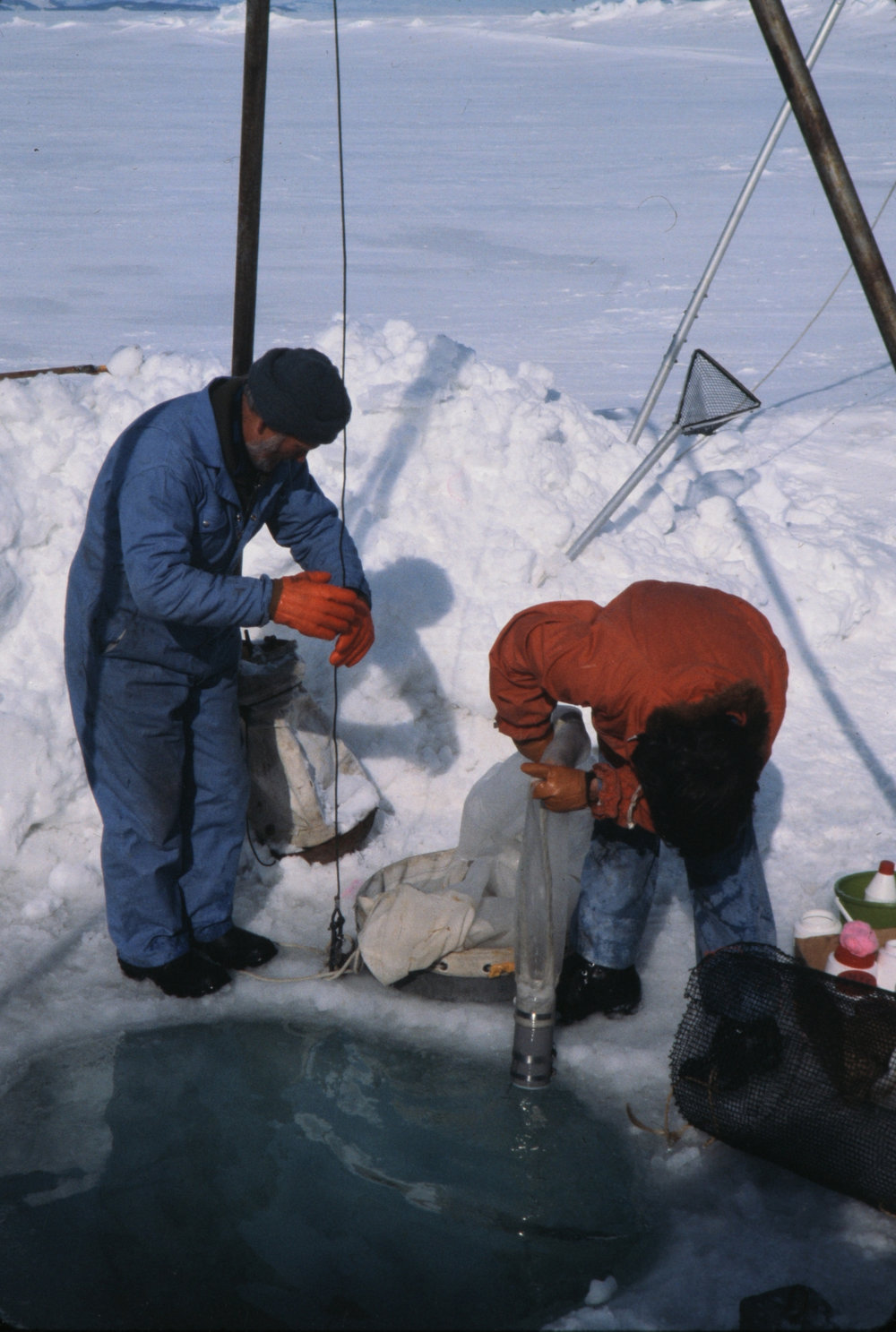 DescriptionProfessor Knox and L. Pierce sampling a water column.DepictsProfessor KnoxL PiercePhotographerNigel S RobertsSeason1979-1980Date Taken1979-1980 SeasonOriginalSlideNo. People2-5