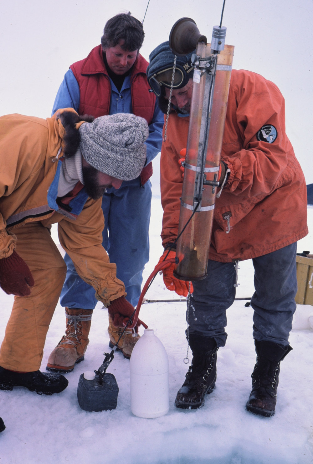 DescriptionRounick, Osborne, and Professor Knox with water sample.DepictsRounickOsborneProfessor KnoxPhotographerKim WesterskovProgrammeK016Season1982-1983Date Taken1982-1983 SeasonOriginalSlideNo. People2-5