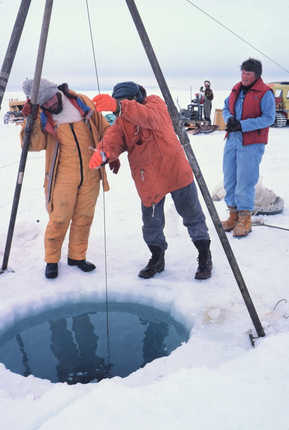 DescriptionRounick, Knox, Shanks and Osborne-Knox sneds down 'messenger' to close water bottle.DepictsRounickProfessor KnoxShanksOsbornePhotographerKim WesterskovProgrammeK016OriginalSlideNo. People2-5