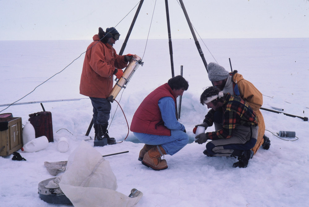 DescriptionProfessor Knox attaches water bottle to wire while Osborne, Shanks and Rounick examine plankton sample.DepictsProfessor KnoxOsborneShanksRounickPhotographerKim WesterskovProgrammeK016Season1982-1983Date Taken1982-1983 SeasonOriginalSlideNo. People2-5