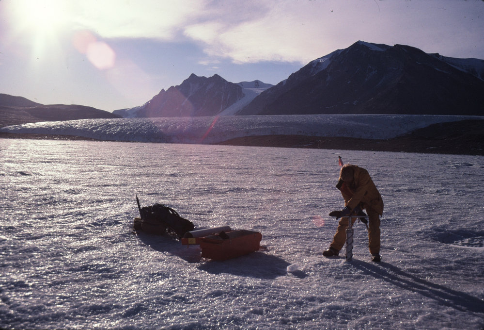 DescriptionDrilling hole for lake sapling on Lake Fryxell.PhotographerGillian WrattProgrammeK081Season1985-1986Date TakenBetween 1st November 1985 and 30th November 1985OriginalSlideNo. People1LocationLake FryxellGeolocation[1] Position