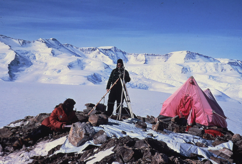 DescriptionSurveying from 1176 Brittanica Range and Mt McClintock. Darwin GL Project.PhotographerBill KingSeason1977-1978Date TakenBetween 1st January 1978 and 31st December 1978OriginalSlideNo. People2-5LocationMcClintock RidgeGeolocation[1] Position