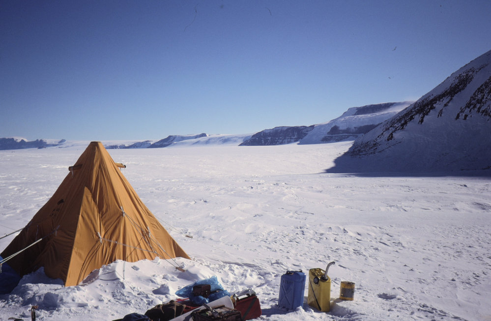 DescriptionPortal Mountain Campsite Looking South to Angino Buttress and Skelton Icefall.ProgrammeK013EventK013-8081Season1980-1981Date Taken1980-1981 SeasonOriginalSlideLocationPortal MountainGeolocation[1] Position