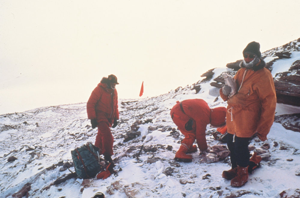 DescriptionCollecting Plant Fossils on Shapeless Mountain. L to R - Steve, Margaret, Sue.PhotographerMargaret BradshawSeason1975-1976Date Taken1975-1976 SeasonOriginalSlideNo. People2-5LocationShapeless MountainGeolocation[1] Position