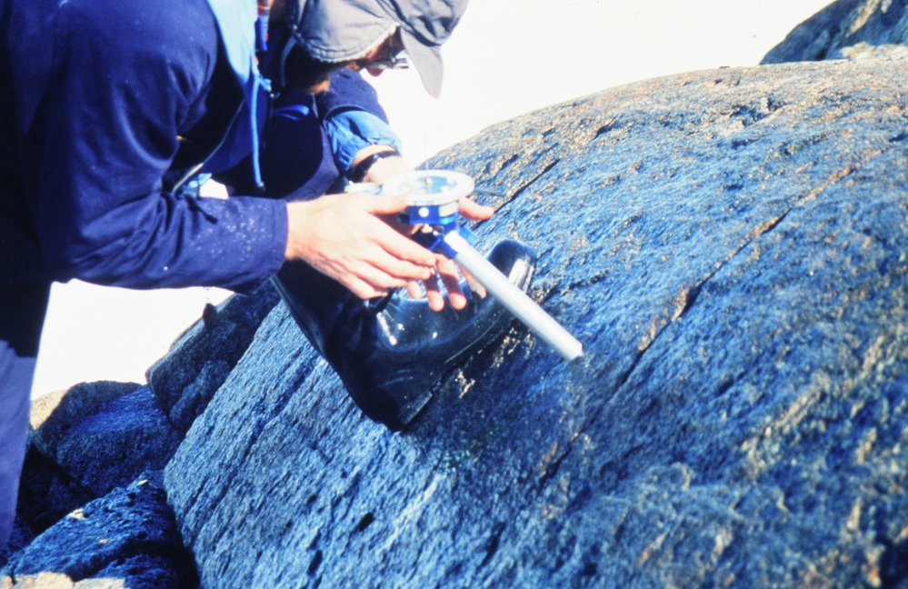 DescriptionOrienting Core of Paleomagnetic Samples with combined inclination measurer sun compass, magnetic compass.PhotographerJ BradshawSeason1990-1991Date Taken1990-1991 SeasonOriginalSlideNo. People1