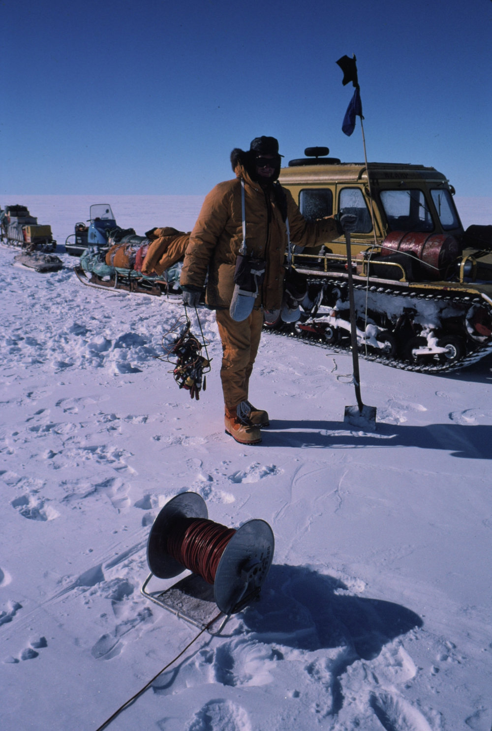 DescriptionWhiteford with a handful of geophonesDepictsWhiteford PhotographerKim WesterskovEventK7-8283Season1982-1983Date TakenBetween 1st December 1982 and 31st December 1982OriginalSlideNo. People1LocationRoss Ice ShelfGeolocation[1] Position
