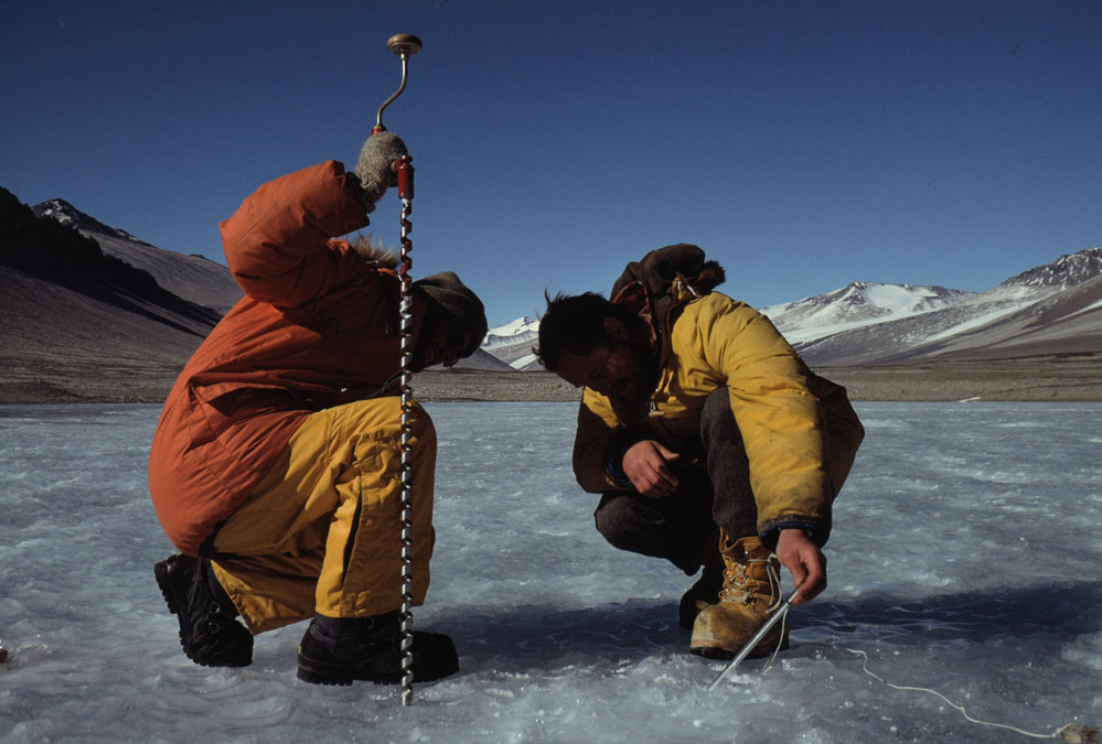 Roger Ridley (with drill) and Ian Maze measuring ice depth on Lake Vanda. Antarctica NZ, accessed 16/04/2026, https://adam.antarcticanz.govt.nz/nodes/view/16425