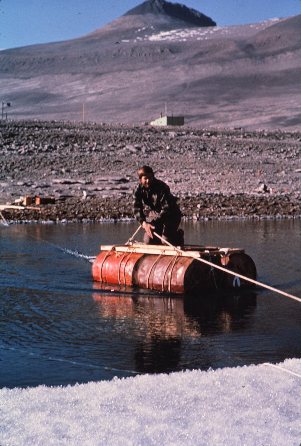 DescriptionCrossing Lake for Hydrological TestingPhotographerR McKerrowSeason1969-1970Date Taken1969-1970 SeasonOriginalSlideNo. People1LocationLake VandaGeolocation[1] Position