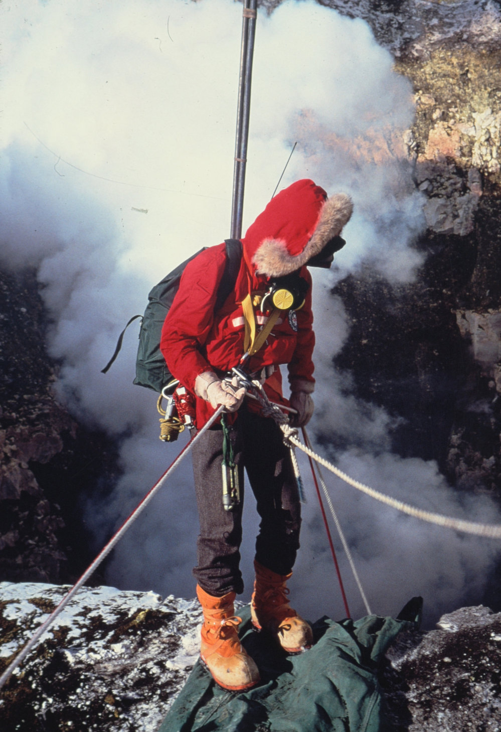 DescriptionWerner entering inner craterDepictsWerner GiggenbachPhotographerColin MonteathSeason1978-1979Date TakenBetween 1st December 1978 and 31st December 1978OriginalSlideNo. People1LocationMount ErebusGeolocation[1] Position