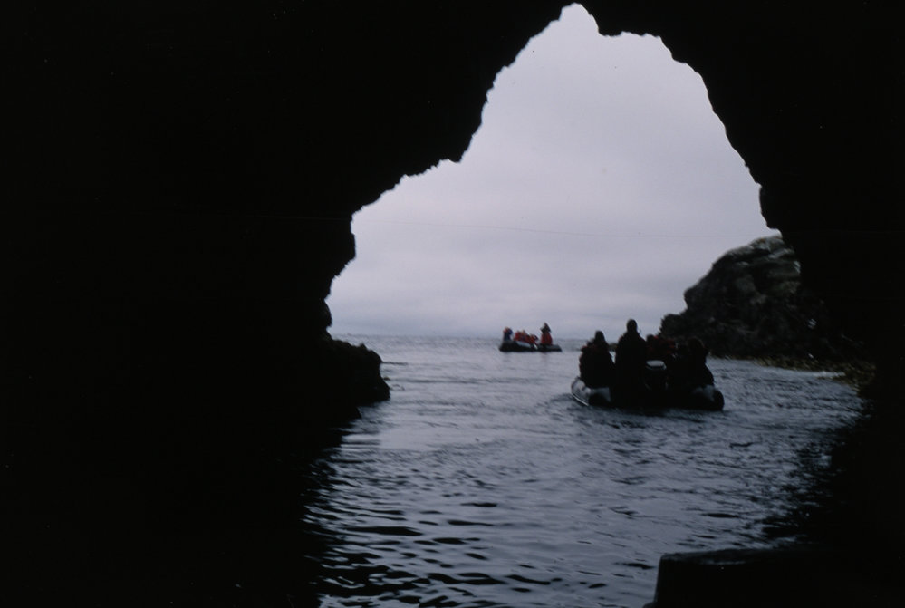 DescriptionZodiac Cruising through caves on Snares island.PhotographerNicola HolmesSeason1992-1993Date TakenBetween 1st January 1993 and 31st January 1993OriginalSlideNo. People>10LocationSnares IslandGeolocation[1] Position