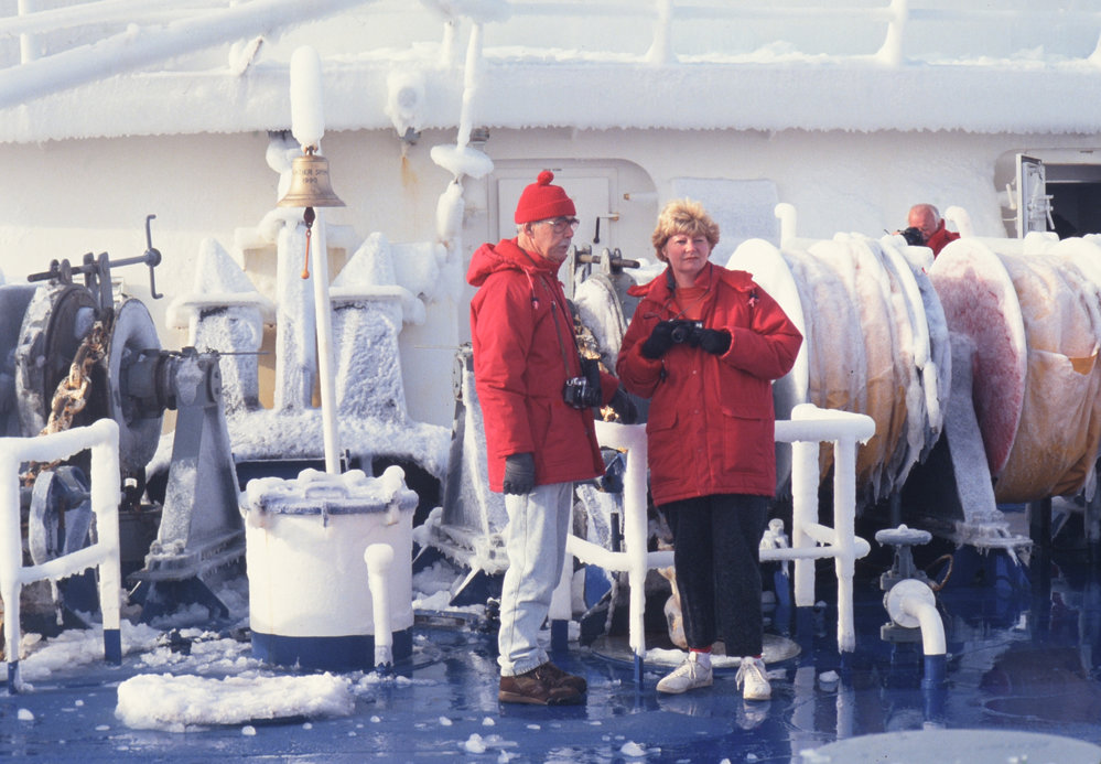 DescriptionPassengers and Ice on Frontier Spirit.PhotographerGillian WrattSeason1992-1993Date TakenBetween 1st February 1993 and 28th February 1993OriginalSlideNo. People2-5