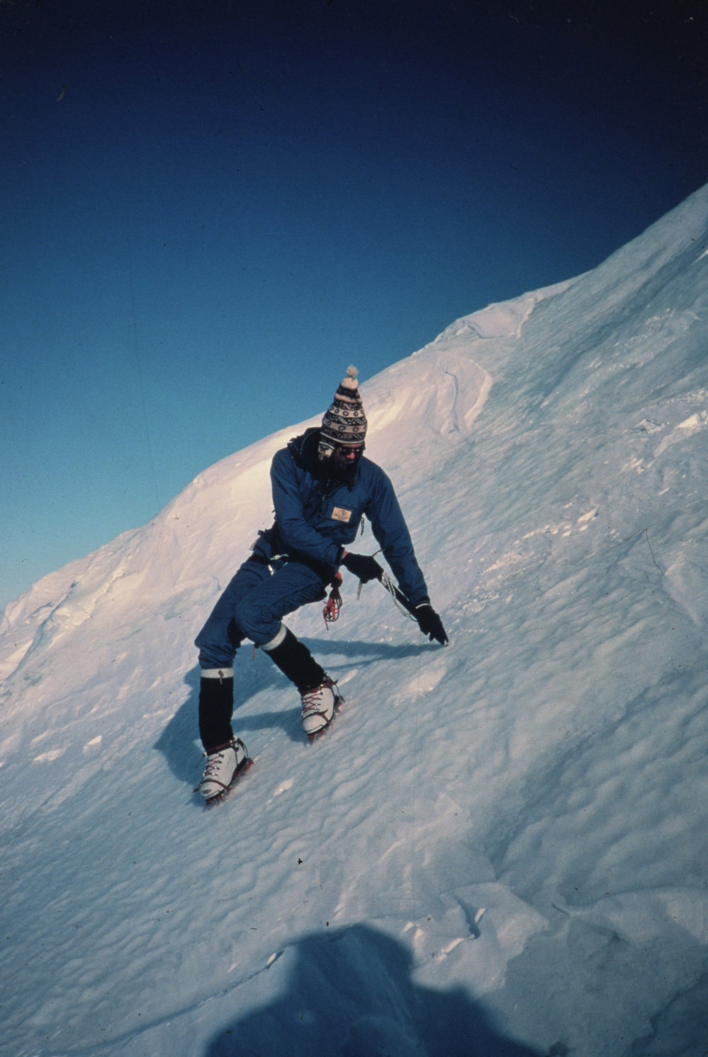 DescriptionRob Hall demonstrating cross-body axe position on hard iceDepictsRob HallPhotographerLindsay MainSeason1983-1984Date Taken1983-1984 SeasonOriginalSlideNo. People1