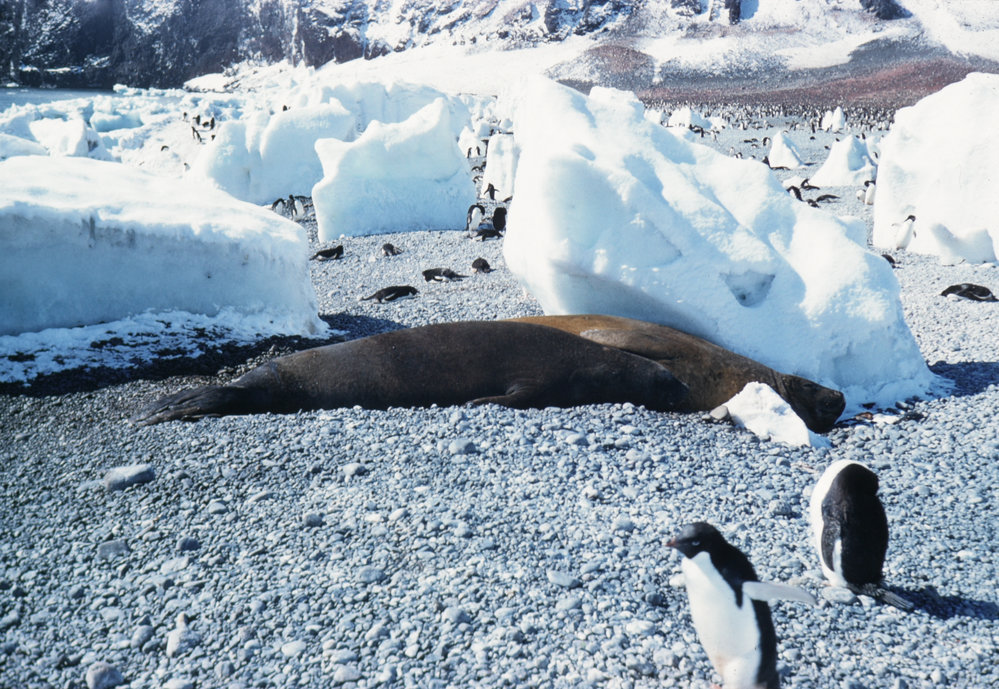 DescriptionElephant seals, one half grown with a femalePhotographerBrian ReidSeason1959-1960Date Taken1959-1960 SeasonOriginalSlideLocationCape AdareGeolocation[1] Position