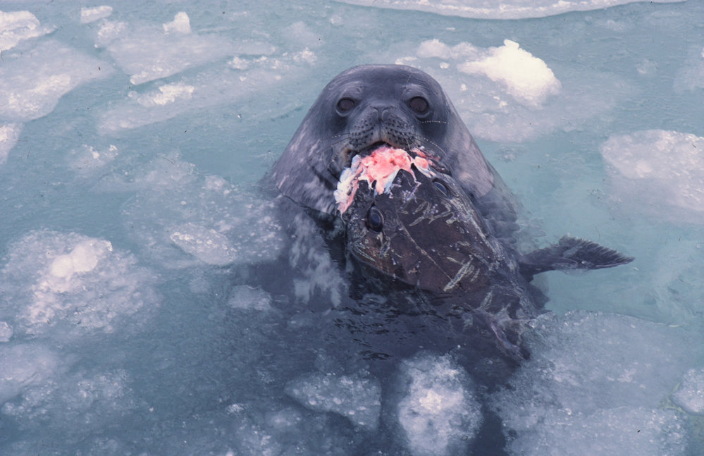 DescriptionWeddell seal with Antarctic codPhotographerKim WesterskovSeason1982-1983Date Taken1982-1983 SeasonOriginalSlideCopyright OwnerKim WesterskovLocationScott BaseGeolocation[1] Position
