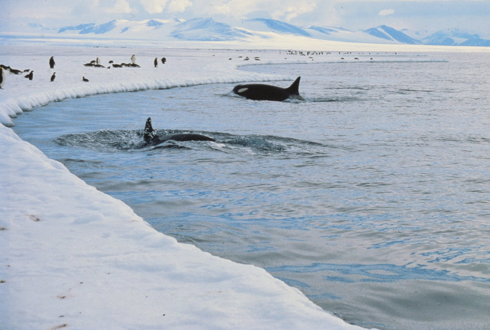 Two Orca patrol the ice edge
