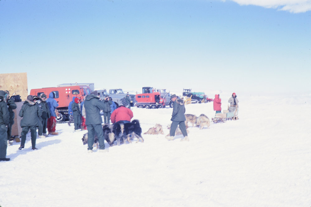 DescriptionWaiting for the arrival of the Starlifter with a dog teamPhotographerJ W BeagleySeason1962-1963Date Taken1962-1963 SeasonOriginalSlideNo. People>10