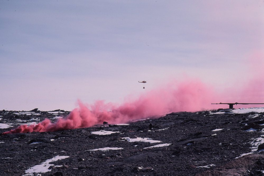 DescriptionSmoke Grenade to give wind direction to helicopter in background with repeater in sling load for Mt NewallPhotographerAlison WelchSeason1984-1985Date Taken1984-1985 SeasonOriginalSlideLocationMount NewallGeolocation[1] Position