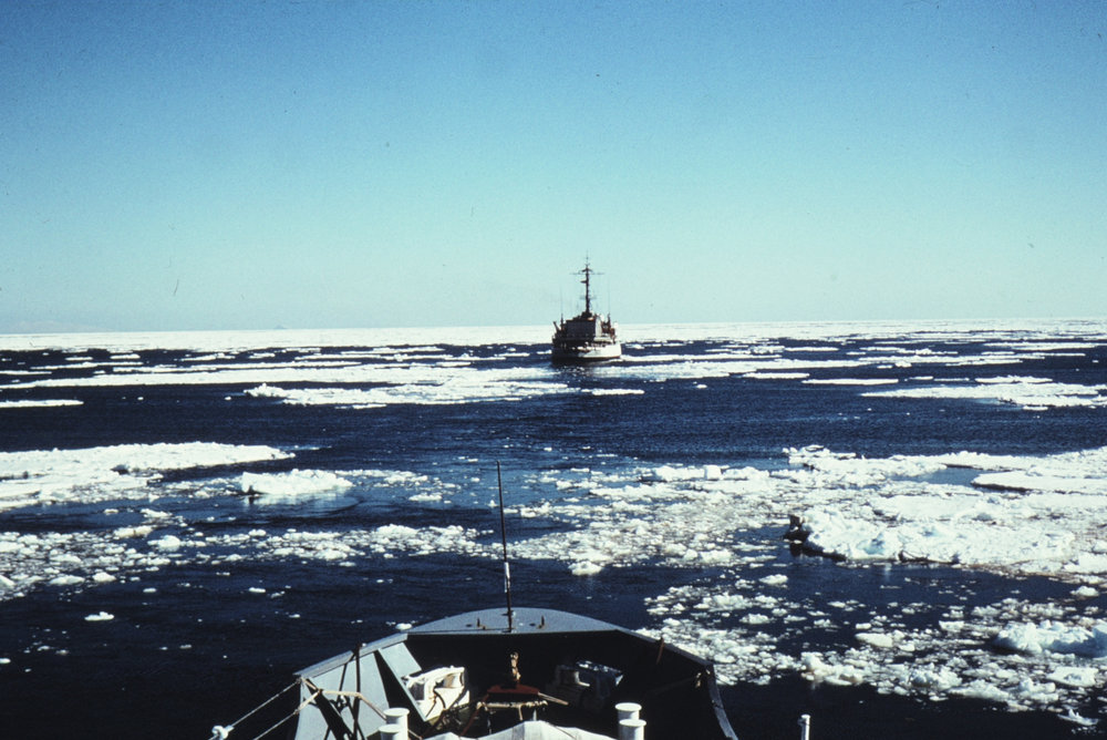 DescriptionIcebreaker in Distance, view from the Endeavour (bow in foreground)PhotographerD HodgeSeason1966-1967Date Taken1966-1967 SeasonOriginalSlide