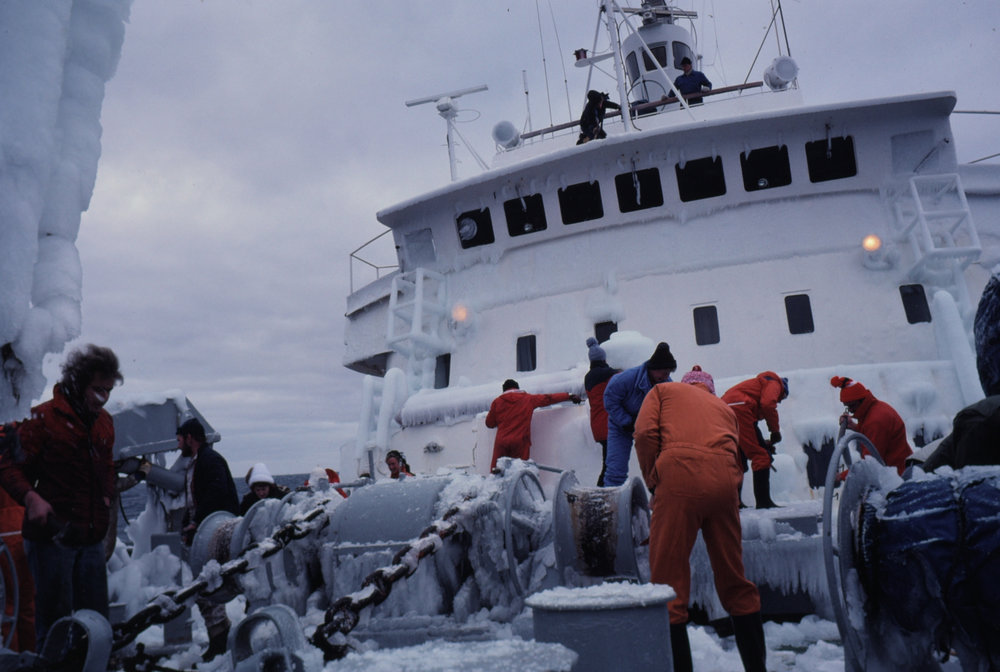 DescriptionDeicing Cruise Ship Lindblad Explorer in the Amundsen SeaPhotographerColin MonteathSeason1982-1983Date TakenBetween 1st February 1983 and 28th February 1983OriginalSlideNo. People>10LocationAmundsen Sea