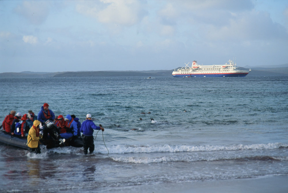 DescriptionZodiac from the 'Frontier Spirit' landing on the beach at Enderby Island. Hooker Sea lions in the waterPhotographerGillian WrattSeason1992-1993Date TakenBetween 1st February 1993 and 28th February 1993OriginalSlideNo. People>10LocationEnderby IslandGeolocation[1] Position