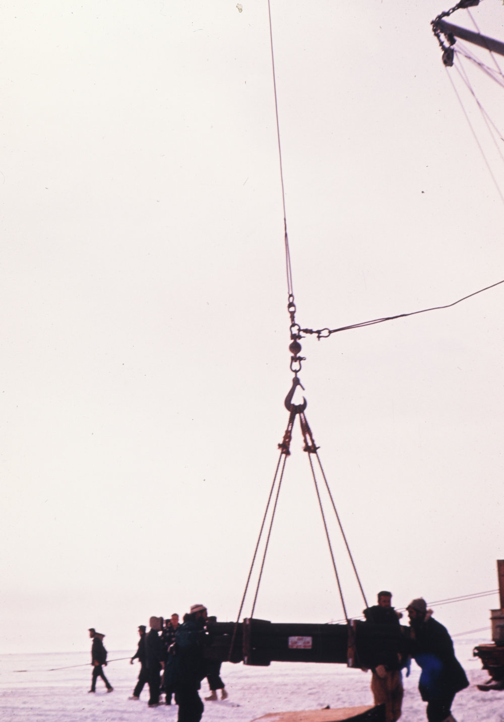 Loading railway sleepers onto sledges from HMNZS Endeavour