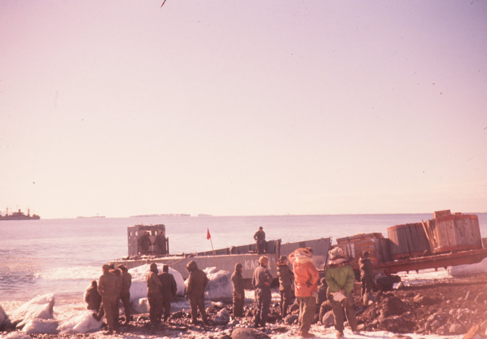 DescriptionHallett Station, offloading from landing craftPhotographerR UnwinSeason1960-1961Date TakenBetween 1st March 1961 and 31st March 1961OriginalSlideNo. People>10LocationHallett StationGeolocation[1] Position
